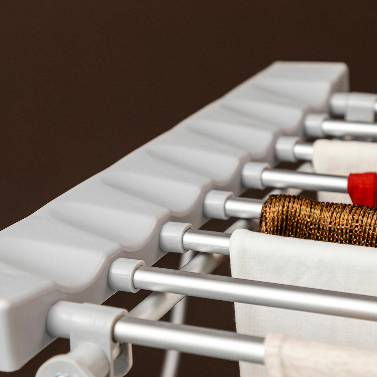 X-förmiges Design: Unser faltbarer elektrischer Wäscheständer ist leicht, robust und sicher. Ein eleganter Wäscheständer in Grau, der aus hochwertigen Materialien hergestellt ist: Aluminium, Polypropylen und ABS. Sein X-förmiges Design verleiht ihm große Stabilität und einen festen Halt.